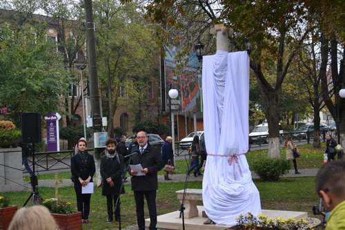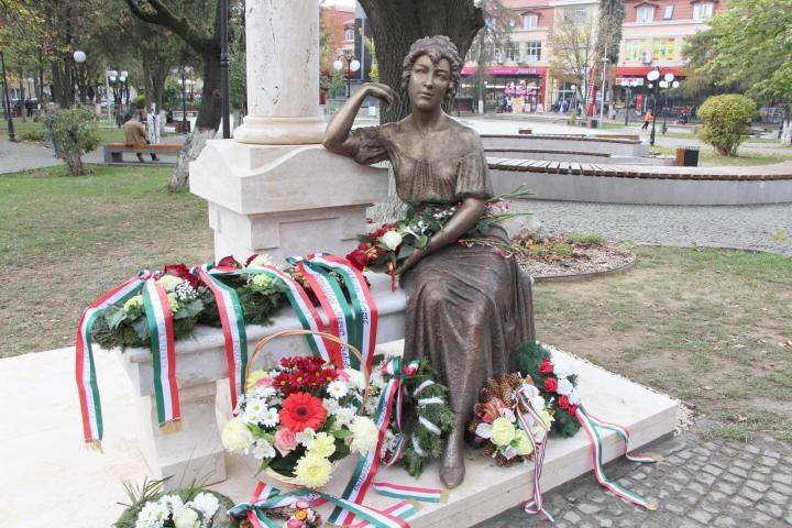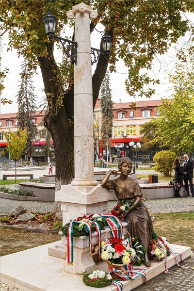 Fedák Mária Lujza, Fedák Sári színésznõ testvérének Venezuelában élõ unokája (j) Fedák Sári egészalakos szobra mellett az avatóünnepségen a mûvész szülõvárosában, Beregszász fõterén 2018. október 26-án. A színésznõ születésnapján felavatott szoborkompozíciót Mihajlo Kolodko ungvári szobrász készítette.