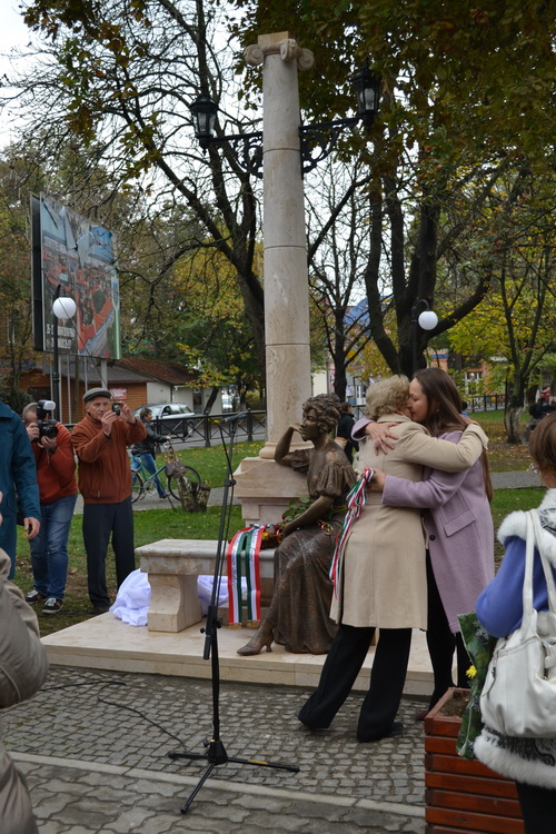 Fedák Mária Lujza, Fedák Sári színésznõ testvérének Venezuelában élõ unokája (j) Fedák Sári egészalakos szobra mellett az avatóünnepségen a mûvész szülõvárosában, Beregszász fõterén 2018. október 26-án. A színésznõ születésnapján felavatott szoborkompozíciót Mihajlo Kolodko ungvári szobrász készítette.