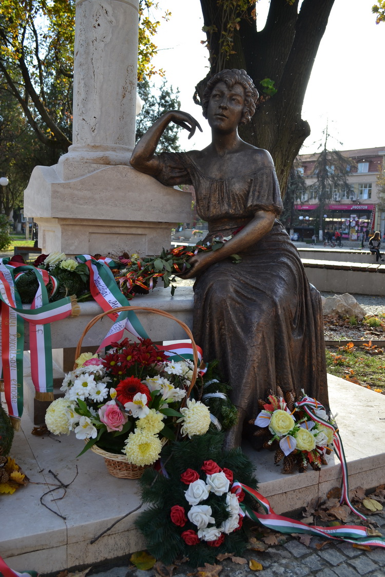 Fedák Mária Lujza, Fedák Sári színésznõ testvérének Venezuelában élõ unokája (j) Fedák Sári egészalakos szobra mellett az avatóünnepségen a mûvész szülõvárosában, Beregszász fõterén 2018. október 26-án. A színésznõ születésnapján felavatott szoborkompozíciót Mihajlo Kolodko ungvári szobrász készítette.