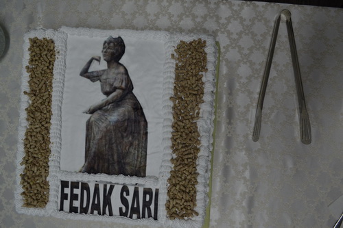 Fedák Mária Lujza, Fedák Sári színésznõ testvérének Venezuelában élõ unokája (j) Fedák Sári egészalakos szobra mellett az avatóünnepségen a mûvész szülõvárosában, Beregszász fõterén 2018. október 26-án. A színésznõ születésnapján felavatott szoborkompozíciót Mihajlo Kolodko ungvári szobrász készítette.